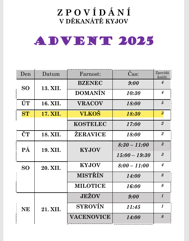 středa před prvním pátkem - půl hodiny přede mší svatou tj.17:30 hod